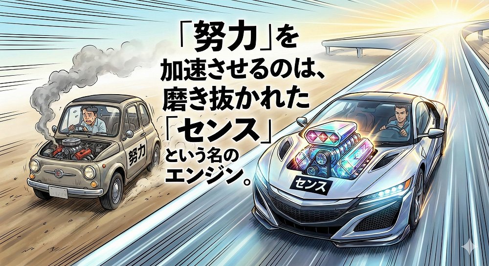 これを車のエンジンに例えると分かりやすいかもしれません。センスのある人ほど、大きなエンジンを積んでいるということです。小さいエンジンでも、必死にアクセルを吹かせばある程度まではついていけます。しかし、いざという時の「加速力」や「最高速度」は、大きなエンジンには到底かないません。